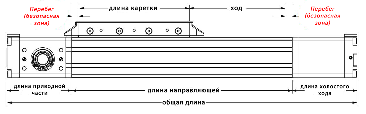 При расчетах линейного слайдера или линейного привода, необходимо уделить большое внимание длине хода. Не менее важным является пространство между кареткой и концом блока, которого каретка достигает в конце хода. Это дополнительное пространство, известно как «перебег». Необходимо правильно рассчитать необходимые зоны безопасности или расстояния, для безопасной остановки каретки на приводе. Несколько факторов влияют на расстояние, необходимое для безопасной остановки каретки, в том числе способы перемещения, винтовые, ременные и т.д., требования по скорость, и положение датчиков в конце хода, все это необходимо учитывать при определении длины допустимого перебега.